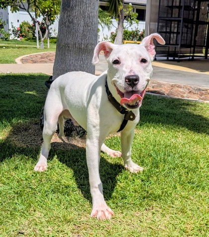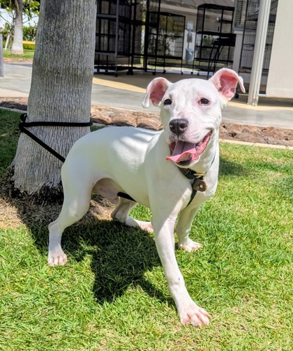 Meet Zero, a seven-month-old Terrier and Pitbull mix with silky white fur and the cutest black-spotted ears. Zero’s story is one of resilience as she came to us as a hungry stray and has blossomed into one of the happiest, most loving pups you’ll ever meet. Her cheerful spirit and constant smile brighten every room she walks into. She’s friendly, affectionate, easy to walk on a leash and ready to share her big heart with a family of her own. Adopt Zero at our Kosasa Family Campus in Ewa Beach!