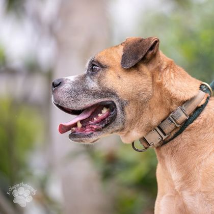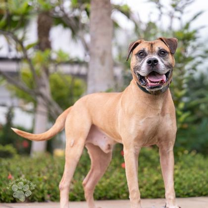 Cleatus is a 9-year-old Boxer mix weighing 66 pounds who is ready to find a loving home. This handsome boy is friendly, social, and enjoys being around people—he’s known to greet visitors with a wagging tail and lean in for pets. Cleatus already knows “sit” and “paw,” showing off his great manners and eagerness to connect with his humans. He enjoys getting out for walks and spending time with his handlers, and while he may pull a little when excited, he’s happy to be by your side exploring the world. With his sweet personality, expressive Boxer face, and affectionate nature, Cleatus would make a wonderful companion for someone looking for a loyal, loving dog to share their days with. Come meet Cleatus at our Kosasa Family Campus in Ewa Beach.