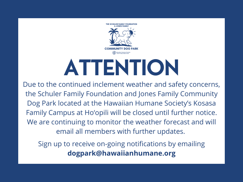 - Hawaiian Humane Society Schuler Family Foundation & Jones Family Community Dog Park will be closed for routine maintenance throughout the month. In addition, we will be closed for special events a few times throughout the year. Please check our website for the most up-to-date hours of operations.