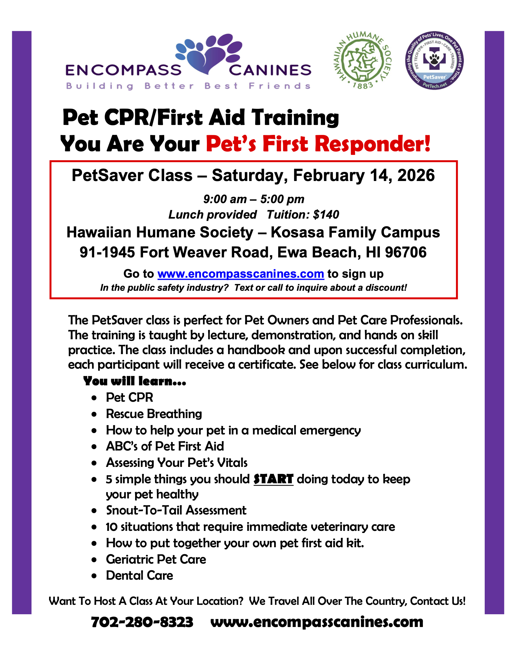 This program includes hands-on instruction for your to become your pet’s first responder. At the end of this course you will be able properly identify and evaluate the signs and symptoms of a pet in distress and perform the appropriate interventions to save their life.