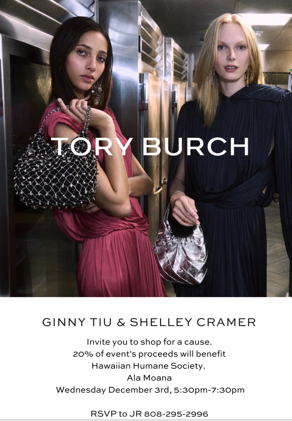Mark your calendars for a wonderful evening of style and compassion. Hawaiian Humane Society board members Ginny Tiu and Shelley Cramer invite you to a special shopping event at Tory Burch in Ala Moana Center on Wednesday, December 3, 2025 from 5:30 pm to 7:30 pm.